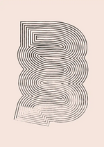 Dit abstracte schilderij toont een zwarte lijnillustratie van een vervormde letter 'B' met meerdere concentrische lijnen die een driedimensionaal effect vormen op een effen lichtroze achtergrond, geschikt als wanddecoratie voor binnenshuis.