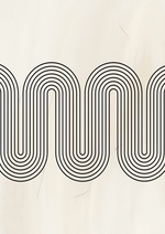 Een monochrome schilderij met een repetitief golfpatroon dat bestaat uit meerdere zwarte lijnen op een gestructureerde, gebroken witte achtergrond. De lijnen creëren een vloeiend, ononderbroken golvend ontwerp.
