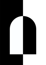 Een minimalistisch zwart-wit schilderij met een boog waarvan de linkerhelft in zwart en de rechterhelft in wit is, waardoor een contrasterend symmetrisch ontwerp ontstaat.