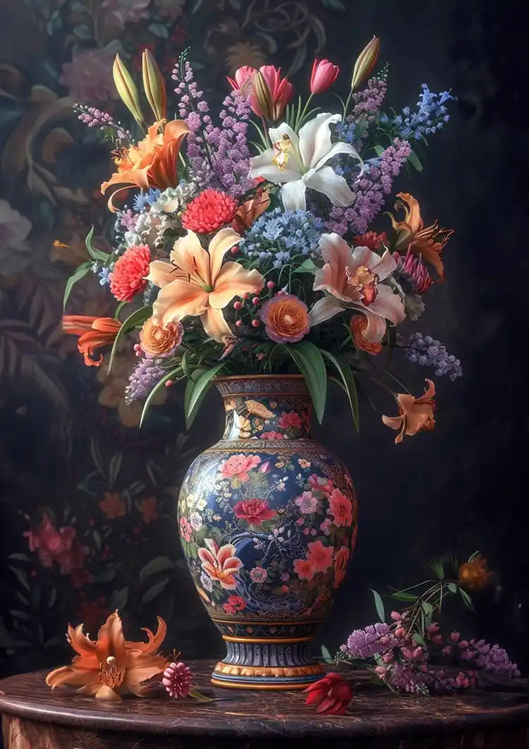 Op dit schilderij zie je een prachtige keramische vaas, gedecoreerd met ingewikkelde bloempatronen en gevuld met een weelderig boeket van lelies, rozen en tulpen. Het staat op een houten tafel, met enkele bloemen verspreid over de basis.