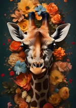 Dit schilderij toont een kop van een giraffe die tevoorschijn komt uit een dichte cluster van kleurrijke bloemen in verschillende tinten oranje, geel en blauw, tegen een donkere blauwgroene achtergrond.