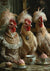 Op dit schilderij zie je drie kippen in elegante outfits, compleet met parelkettingen en veren hoofddeksels, rond een tafel met theekopjes en cupcakes. De weelderige, klassieke omgeving creëert een speelse, verfijnde sfeer.