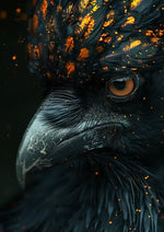 Dit schilderij toont een close-up van een vogel met donkere veren en opvallende oranje vlekken, vooral op zijn kop. Zijn scherpe snavel en intense, doordringende ogen, met een prominente pupil, steken mooi af tegen een onscherpe, donkere achtergrond.