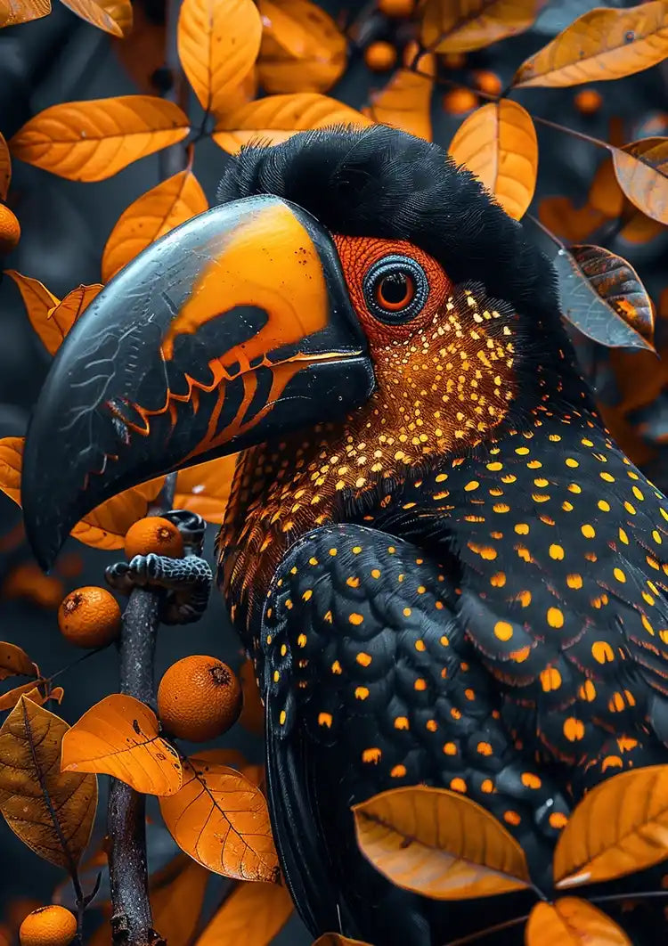 Op dit schilderij zie je een prachtige vogel met levendige oranje en zwarte veren, hoog zittend tussen oranje bladeren en vruchten. Met zijn grote, gebogen snavel en gedetailleerde stippenpatronen op zijn veren, straalt de vogel kracht en schoonheid uit.