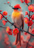 Op dit schilderij zie je een levendige vogel met een felrode kuif, gele borst en donkere staartveren, rustend op een tak omringd door rode bloemen. De zacht vervaagde achtergrond laat de vogel en de gedetailleerde bloemen prachtig naar voren komen.