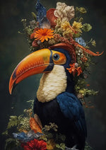 Dit schilderij toont een gestileerd beeld van een toekan met een grote levendige snavel, versierd met een uitgebreide hoofdtooi gemaakt van verschillende kleurrijke bloemen en bladeren tegen een donkere achtergrond.