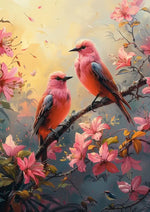 In dit schilderij zie je twee schattige roze vogels op een tak, omringd door levendige bloesems. De warme kleurenmix en zacht vallende bloemblaadjes creëren een serene, pittoreske achtergrond.