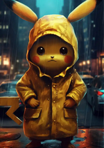 Dit schilderij toont een persoon in een felgele regenjas met capuchon, staand in de regen tegen een wazig stadsbeeld met auto's en gebouwen op de achtergrond, wat een nachtelijke sfeer creëert.