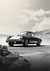 Dit schilderij toont een zwart-witfoto van een klassieke 911 geparkeerd in een open, vlak landschap met rotsachtig terrein op de voorgrond en bewolkte lucht op de achtergrond. De auto heeft een strak design en ronde koplampen.