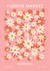 Een schilderij die een "Bloemenmarkt" in Londen aankondigt, pasteleditie voor juli 2021, met een patroon van witte en perzikkleurige bloemen tegen een zachtroze achtergrond.