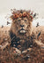 In dit schilderij zit een majestueuze leeuw met volle manen in een veld met hoog gras, gekroond met kleurrijke bloemen. Vogels zweven rond en rusten op de leeuw en het omliggende groen, terwijl de wazige hemel een betoverend wildernistafereel creëert.