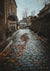 Dit schilderij toont een straat met natte bladeren en oude gebouwen die naar een kasteel leiden onder een sombere hemel.