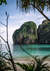Een schilderij met uitzicht op een grote rots met daarvoor helder mooi water.