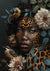 In dit schilderij zie je een vrouw met een donkere huid, blauwe ogen en een cheetah-achtig bontpatroon op haar gezicht en schouders. Haar hoofd is prachtig versierd met grote, gedetailleerde bloemen en bladeren.