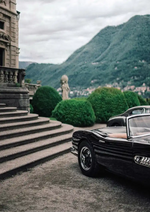 Dit schilderij toont een klassieke BMW cabrio geparkeerd op een oprit naast een groot gebouw, met verzorgde heggen en een berg in de verte onder een bewolkte hemel.