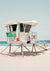 Dit schilderij toont een strandwachttoren op een zandstrand onder een heldere hemel, met het opschrift "Lifeguard On Duty"
