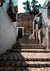 Dit schilderij toont een oude geplaveide trap tussen witte en stenen gebouwen.