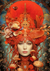 Dit schilderij toont een prachtige dame met een neutrale uitdrukking en een uitgebreide rode hoofdtooi met paddenstoelen en bloemen tegen een achtergrond van levendige blauwtinten.