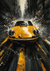 Dit schilderij toont een levendige gele sportwagen die door een dramatische plas water rijdt in een donkere straat, waardoor een contrast van kleuren en een gevoel van beweging ontstaat. Omliggende gebouwen en abstracte spatten water dragen bij aan het dynamische tafereel.