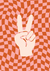 Dit schilderij toont een grafische illustratie van een hand die een 'Peace teken' maakt tegen een geruite oranje en roze achtergrond.