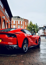 Dit schilderij toont een glans rode Ferrari 812 Superfast geparkeerd in een natte straat op een plein, met de achterkant en passagierszijde zichtbaar.