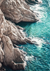Een schilderij met rotsen en heel mooi water, die tegen de rotsen aan komt.