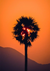 Een schilderij van een palmboom met tussen de bladeren een deel van de zon.