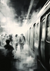 Een zwart-wit schilderij vervaagd van passagiers die in een trein stappen.