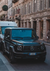 Dit schilderij toont een zwarte Mercedes G wagon geparkeerd in een luxe straat voor een exclusieve modewinkel.