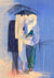 Twee mensen onder een paraplu in de regen, in zachte lijnen en tinten blauw en beige getekend.