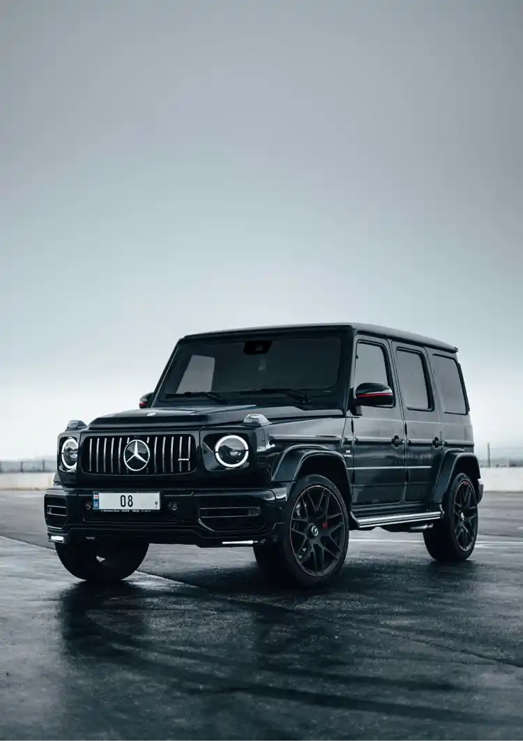 Dit schilderij toont een zwarte Mercedes G klasse geparkeerd op een nat oppervlak, onder een bewolkte hemel. De auto is voorzien van opvallende ronde koplampen en een opvallende, rechtopstaande grille.