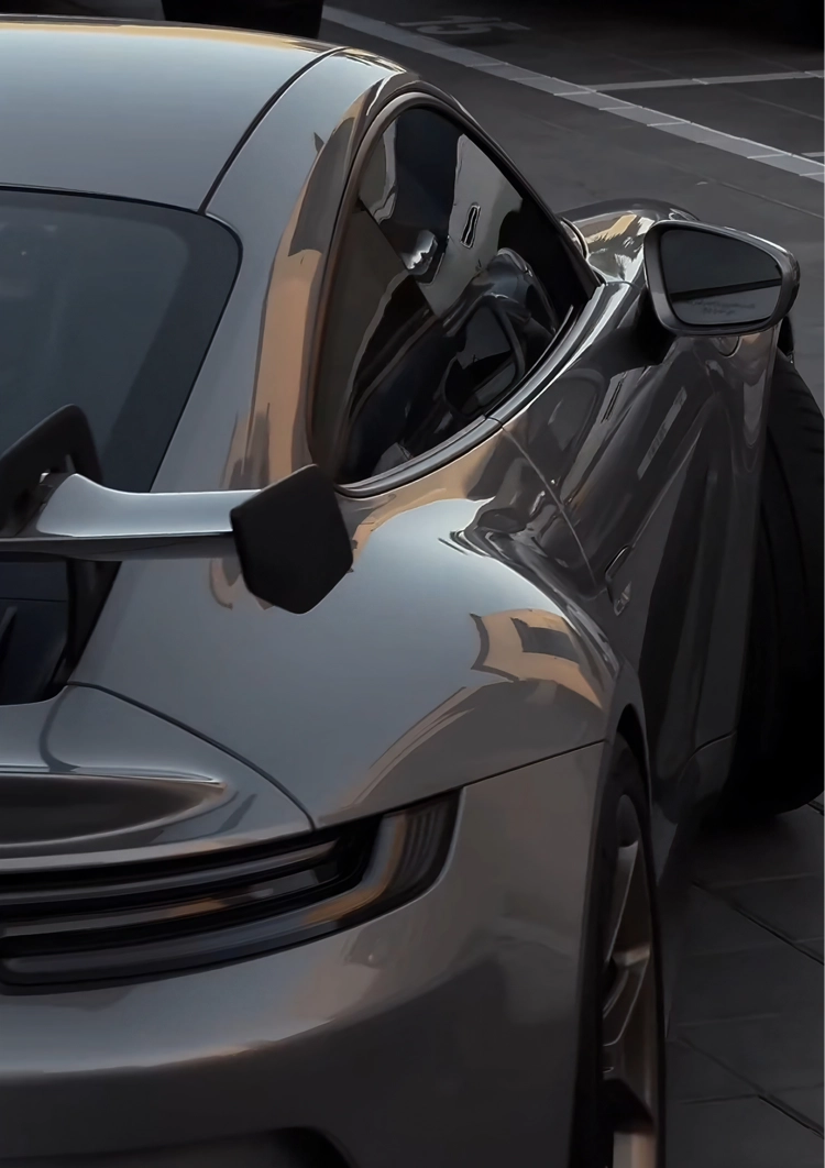 Dit schilderij toont een gedetailleerde close-up van een stoere, donkergrijze sportwagen in een schaduwrijk gebied, waarbij de glanzende carrosserie en vloeiende lijnen opvallen. Een krachtig en dynamisch beeld van auto-esthetiek.