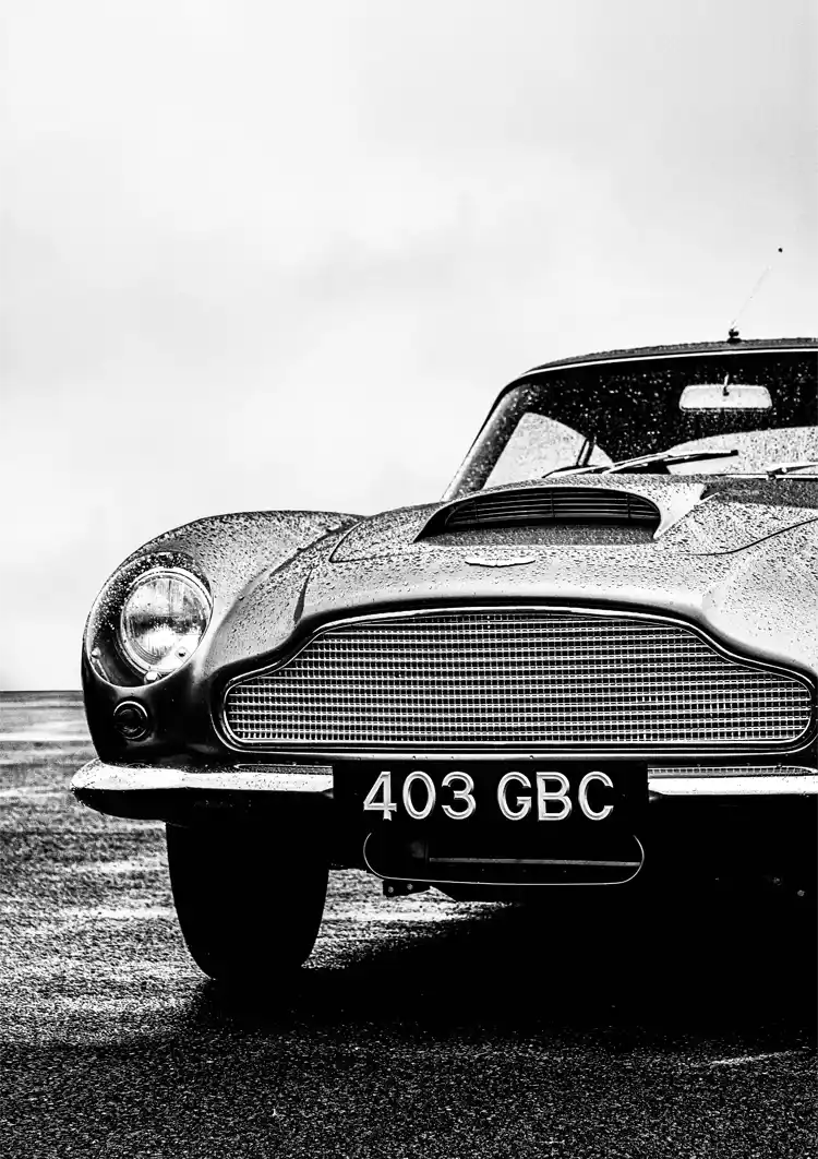 Dit schilderij toont een zwart-witfoto van een prachtige Aston Martin, nat van de regen, geparkeerd op een grijze, bewolkte dag. De focus ligt op de rechtervoorzijde van de auto, wat het strakke ontwerp benadrukt.