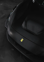 Dit schilderij toont een bovenaanzicht van de motorkap van een matzwarte Ferrari F8 Tributo met een opvallend geel-zwart embleem in het midden. Het strakke design van de auto wordt benadrukt tegen een donkere achtergrond.