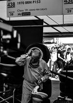 Dit schilderij toont een oudere man in een race-uniform die zijn helm heeft afgedaan bij een Formule 1-auto in een druk paddockgebied, met banden en toeschouwers zichtbaar op de achtergrond.