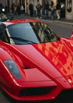 Dit schilderij toont een rode Ferrari Enzo geparkeerd op straat, met zijn opvallende strakke lijnen en Ferrari-logo zichtbaar. De achtergrond toont een drukke stadsomgeving met voetgangers.