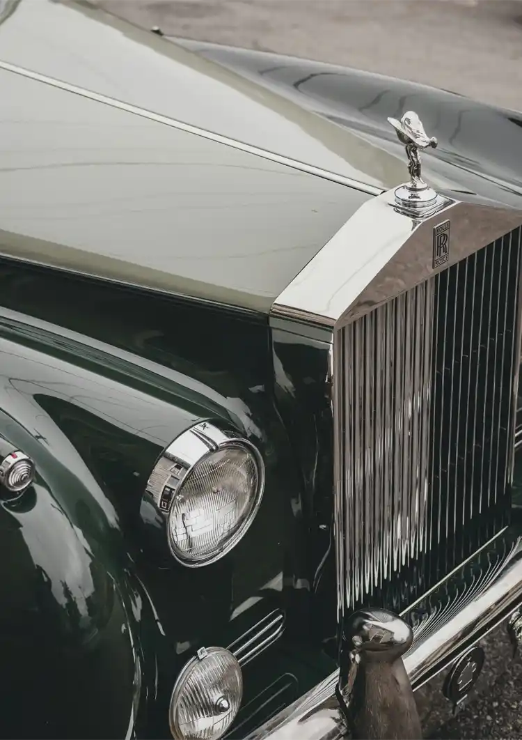 Close-up van de voorkant van een vintage Rolls-Royce, met de iconische grille en het bekende "Spirit of Ecstasy" embleem, met de nadruk op de groene carrosserie en chromen details.