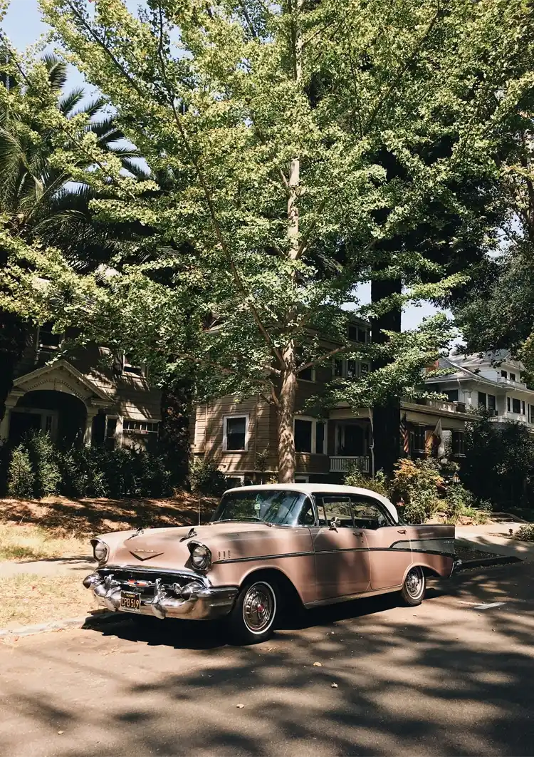 Dit schilderij toont een vintage roze auto geparkeerd onder een grote groene boom in een zonnige straat, met woonhuizen zichtbaar op de achtergrond en een helderblauwe lucht erboven.