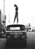 Dit schilderij toont een persoon die in evenwicht bovenop een vintage Volkswagen-busje staat in een stadsstraat in de schemering. Het stadsbeeld op de achtergrond wordt zacht verlicht door straatverlichting. Het beeld wordt vastgelegd in zwart-wit.