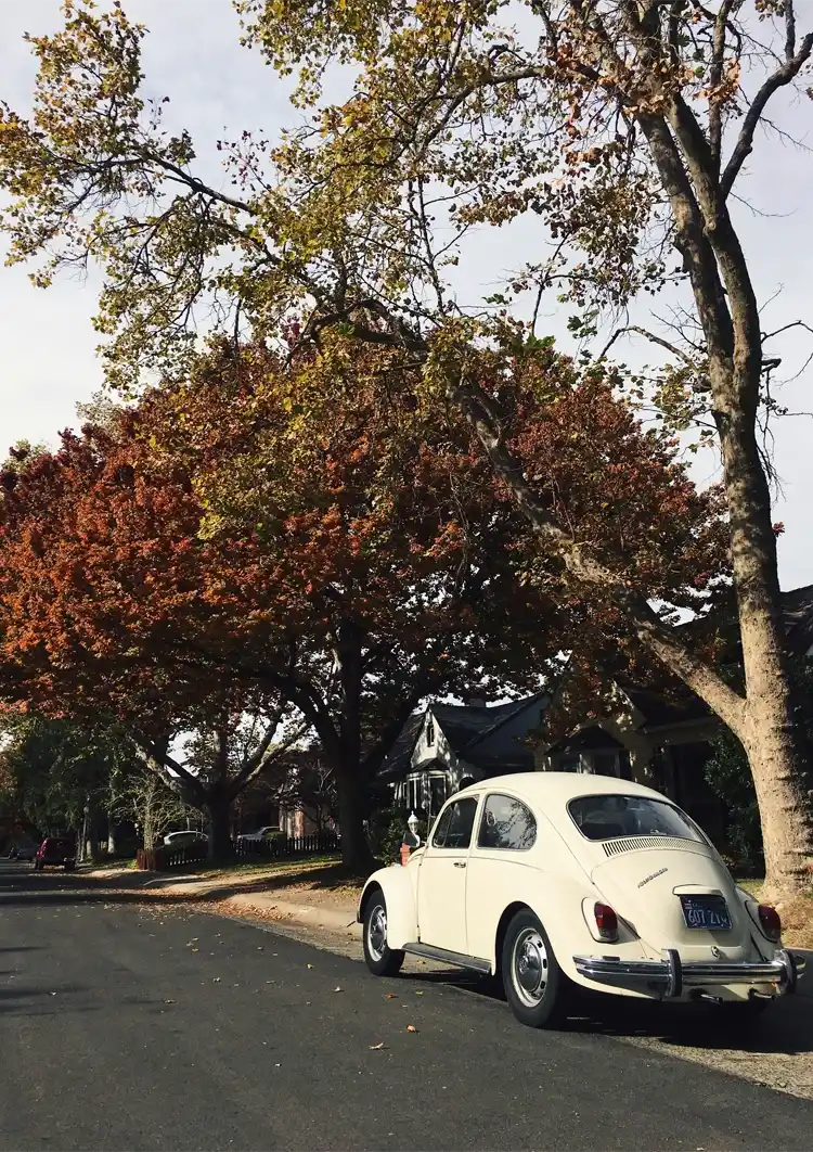 Dit schilderij toont een vintage witte Kever geparkeerd onder een grote boom met herfstkleurige bladeren in een straat in een buitenwijk, met huizen zichtbaar op de achtergrond onder een bewolkte hemel.
