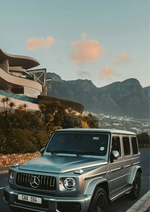 Dit schilderij toont een zilveren Mercedes G wagon geparkeerd op een weg naast moderne architectuur met op de achtergrond een berg onder een heldere hemel tijdens zonsondergang.