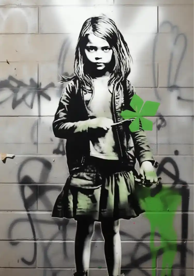 Dit schilderij toont een graffitikunstwerk van een jong meisje in een jurk met een groen klavertje 4, met graffiti.