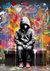 Dit schilderij toont een jongen die op een bankje, tegen een levendige, veelkleurige graffitiachtergrond.