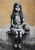Dit schilderij toont een zwart-witte graffiti van een jong meisje zittend op een bankje, afgebeeld in een realistische stijl.