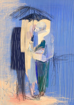 Twee mensen onder een paraplu in de regen, in zachte lijnen en tinten blauw en beige getekend.