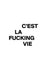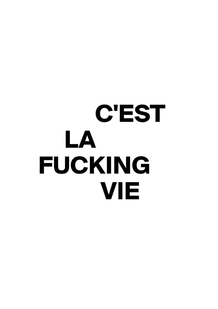Een schilderij met een zwarte tekst op een witte achtergrond staat "c'est la fucking vie" in vetgedrukte hoofdletters.