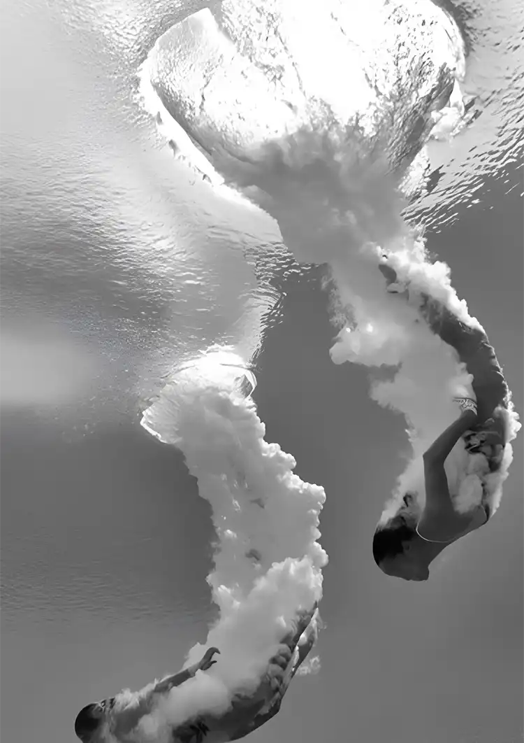 Een zwart-wit schilderij met 2 duikende vrouwen, die met een snelheid door het water gaan.