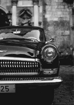 Dit schilderij toont een zwart-witfoto van een oldtimer geparkeerd naast een oud stenen gebouw, met een glimmende grille en ronde koplamp van de auto.