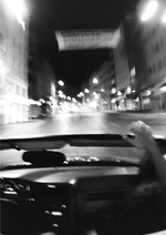 Een schilderij met een bewegend uitzicht, gemaakt vanuit een rijdende auto met open dak.