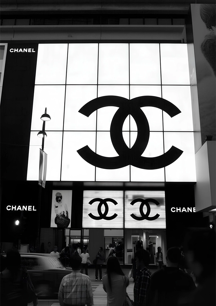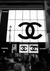 Zwart-wit schilderij van een groot verlicht raam met een groot Chanel logo. Onderaan het raam zijn er mensen en een auto te zien.
